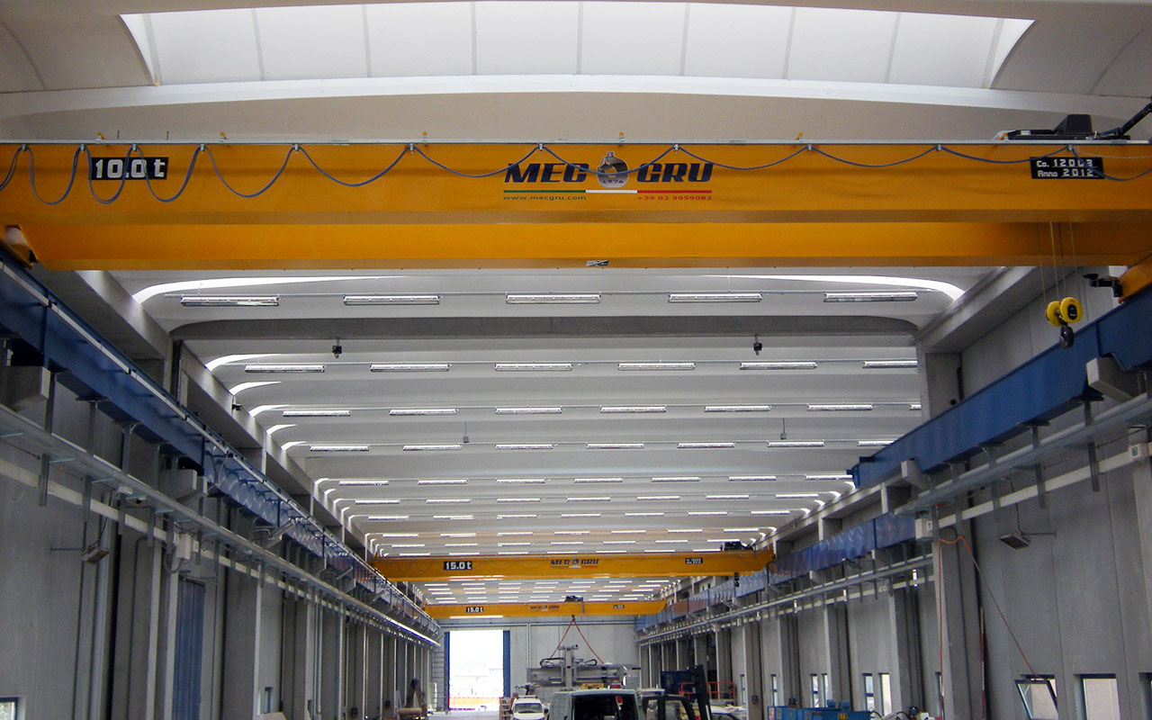 MEC GRU in collaborazione con il cliente ha progettato impianti di sollevamento standard e speciali dotati esclusivamente di componentistica SWF (paranchi – testate – quadri elettrici) e radiocomandi Telecrane Italia.